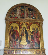 All’interno, a croce latina, nel braccio a sinistra, il trittico di Sano di Pietro, Madonna col Bambino e quattro Santi. A sinistra San Giovanni Battista e San Quirico Martire, a destra San Fortunato e San Giovanni Evangelista.