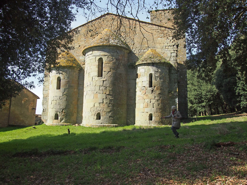 […] presenta una semplice facciata a capanna sulla quale si apre il portale di ingresso, sormontato da un enorme blocco di arenaria che funge da architrave. Costruita in bozze di arenaria locale cavata sul luogo, sempre sulla facciata presenta un’elegante lunetta policroma in bozze di serpentino verde e in marmo bianco; al di sopra della lunetta si apre una bifora, scandita da una colonnina centrale lavorata in arenaria e sormontata dagli archi che richiamano la bicromia della lunetta. La torre campanaria, possente e inaccessibile ospitava in origine la “sperduta”, la campana il cui suono era punto di riferimento per i pellegrini ed i viandanti sorpresi dal calare della notte nei boschi del Montalbano. Di eccezionale importanza la cripta: sulla chiesa originaria risalente al X secolo, la cui testimonianza principale è costituita proprio dalla cripta, venne edificata, poco dopo l’anno Mille, la chiesa attuale. La fondazione è da attribuirsi ai monaci cluniacensi […] presenta piccole volte a crociera: notevoli le mezze colonne di sostegno degli archi delle tre feritoie che illuminano debolmente l’interno, con decorazioni a rilievo. L’unica navata della chiesa superiore culmina nelle tre absidi semicircolari, perfettamente conservate nella loro impostazione originaria. L’abbazia era affiancata nel Medioevo da un monastero, del quale rimangono poche tracce nell’abitazione a fianco. ( di Paolo Santini L’abbazia rischia di crollare ).