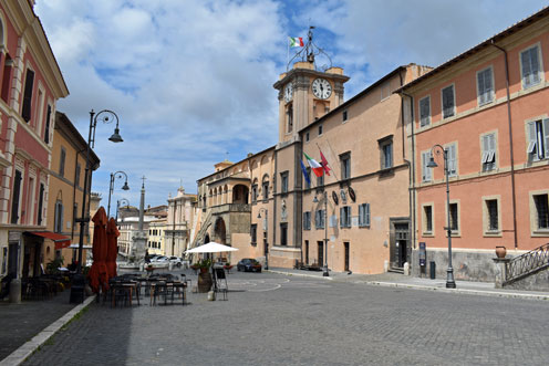 Siamo in piazza Matteotti: la facciata di rifacimento barocco è illegiadrita da un’agile scalinata che si conclude con una loggia. L’arco che si apre sotto la scala conduce in via San Pancrazio. La grande fontana che si apre di fronte al Palazzo comunale ha fattura settecentesca come la chiesa del Suffragio che si fronteggiano nella lunga piazza.