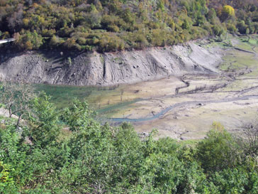 In prossimità della diga si aggiunge allo spettacolo la vista del lago, anche se in questa stagione abbastanza in secca (ma non tanto da far riemergere le spoglie dell’antico paese di Fabbrica), e del suggestivo agglomerato di Vagli di Sotto arroccato su un promontorio di là da uno dei bracci dell’invaso a circa 600 metri di altitudine; alle sue spalle più in alto Vagli di Sopra su un costone allungato, sopra al quale si stagliano le grigie guglie della Penna di Campocatino.