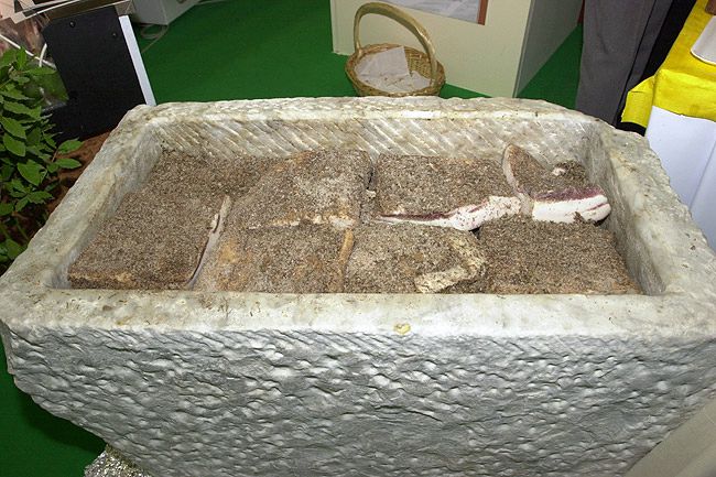 Il marmo è quello dei Canaloni di Colonnata, che ha particolari qualità adatte proprio a questa lavorazione: non assorbe e non trasuda per la sua grana molto fine tanto che questo procedimento non richiede alcun trattamento chimico né conservanti. È l’aria fine di Colonnata insieme alla lavorazione “antica” che fanno di questo lardo una vera specialità.