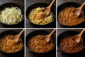 b. In casseruola sciogliere il burro, unire cipolle e zucchero di canna.