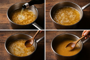 a. In un pentolino ridurre il fondo bruno con il concassé di verdure fino a consistenza sciropposa.