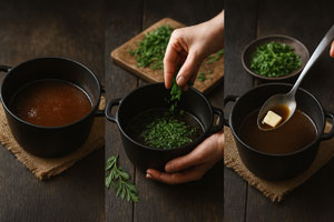 b. Filtrare, poi aggiungere un trito fine di erbe aromatiche fresche.