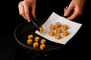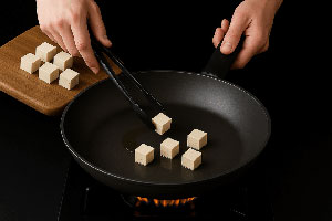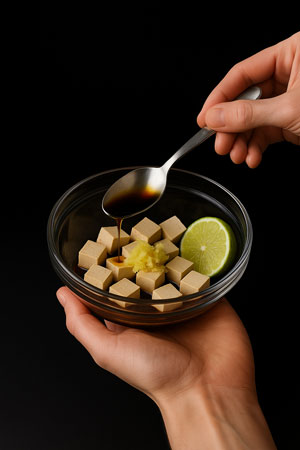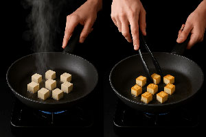 Per prima cosa, taglia il tofu a cubetti regolari (circa 1 cm). Tamponalo con carta assorbente per eliminare l’umidità in eccesso. Poi, in una padella antiaderente, scalda un filo d’olio di arachidi (oppure extravergine delicato). Una volta caldo, rosola i cubetti di tofu su tutti i lati, fino a ottenere una doratura uniforme e croccante. Infine, scolali e tienili da parte su carta assorbente.