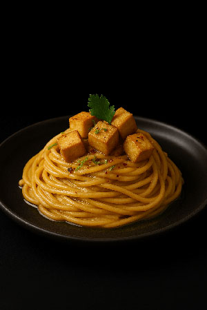 Distribuisci gli spaghetti nei piatti. Poi, guarnisci con i cubetti di tofu dorato, una grattugiata di scorza di lime e, se lo desideri, fiocchi di peperoncino. Per concludere, puoi aggiungere un filo d’olio crudo o una foglia di coriandolo fresco.