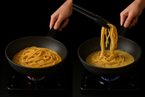 Riaccendi il fuoco e salta gli spaghetti nella crema. Alla fine, la salsa dovrà avvolgere la pasta in modo cremoso.