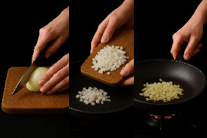 Nel frattempo, trita finemente la cipolla ramata. Falla appassire dolcemente nella stessa padella con un filo d’olio. Appena inizia a imbiondire, aggiungi la pasta di curry verde e mescola per 30 secondi, così da attivare e diffondere gli aromi.