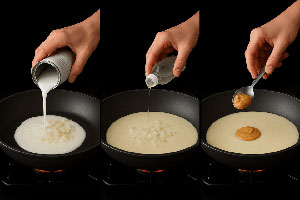 A questo punto, unisci la crema di cocco, l’acqua di cocco e la crema di arachidi. Mescola con cura fino a ottenere una consistenza liscia e fluida. Volendo, puoi aggiungere anche un cucchiaio di salsa di soia per intensificare il gusto. Lascia sobbollire dolcemente, poi spegni la fiamma.