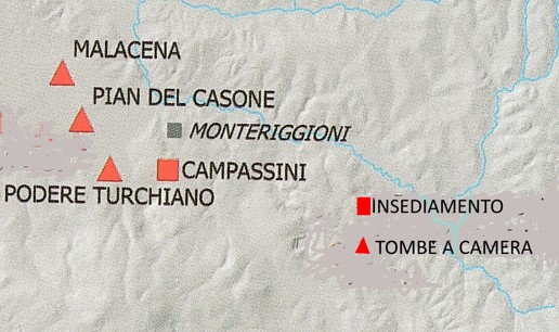 I reperti provengono dal Podere Sensano, da Campassini, il villaggio sulla sommità del pianoro a sud est del colle di Monteriggioni e a est della piana del Casone, dalla Necropoli del Casone, notevoli quelli della Tomba dei Calisna Śepu in podere Malacena, ma anche oggetti di uso quotidiano, ceramica da mensa e da conserva, e di ornamento personale.
