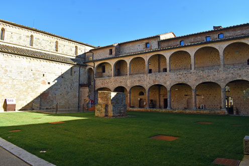 Uno sguardo di saluto ancora al bel chiostro oggi illuminato da caldi raggi di sole decembrino: ora ci aspetta la visita alle Mura del castello di Monteriggioni e la scoperta delle armature che corredano l’Ufficio del Turismo in loco.