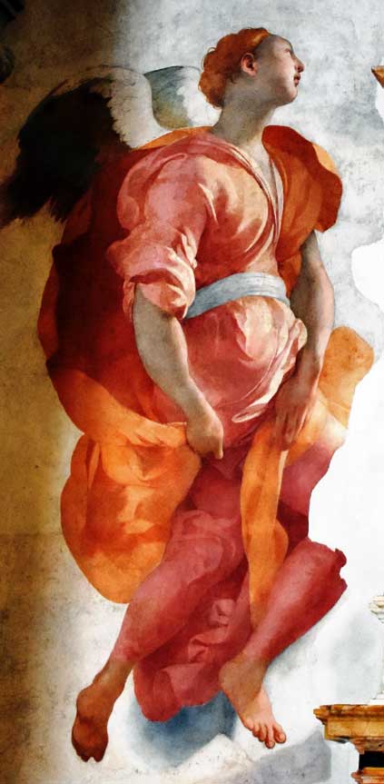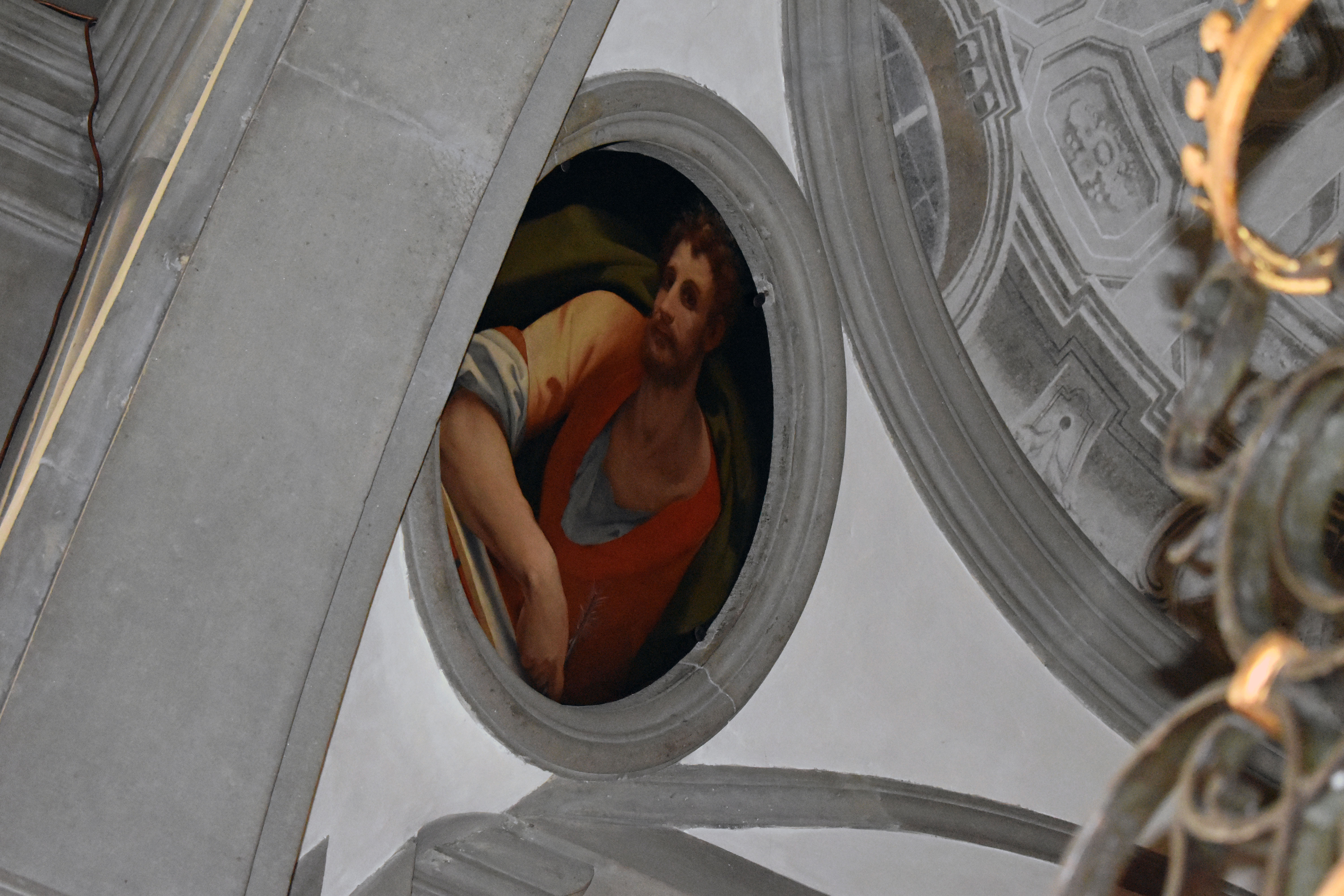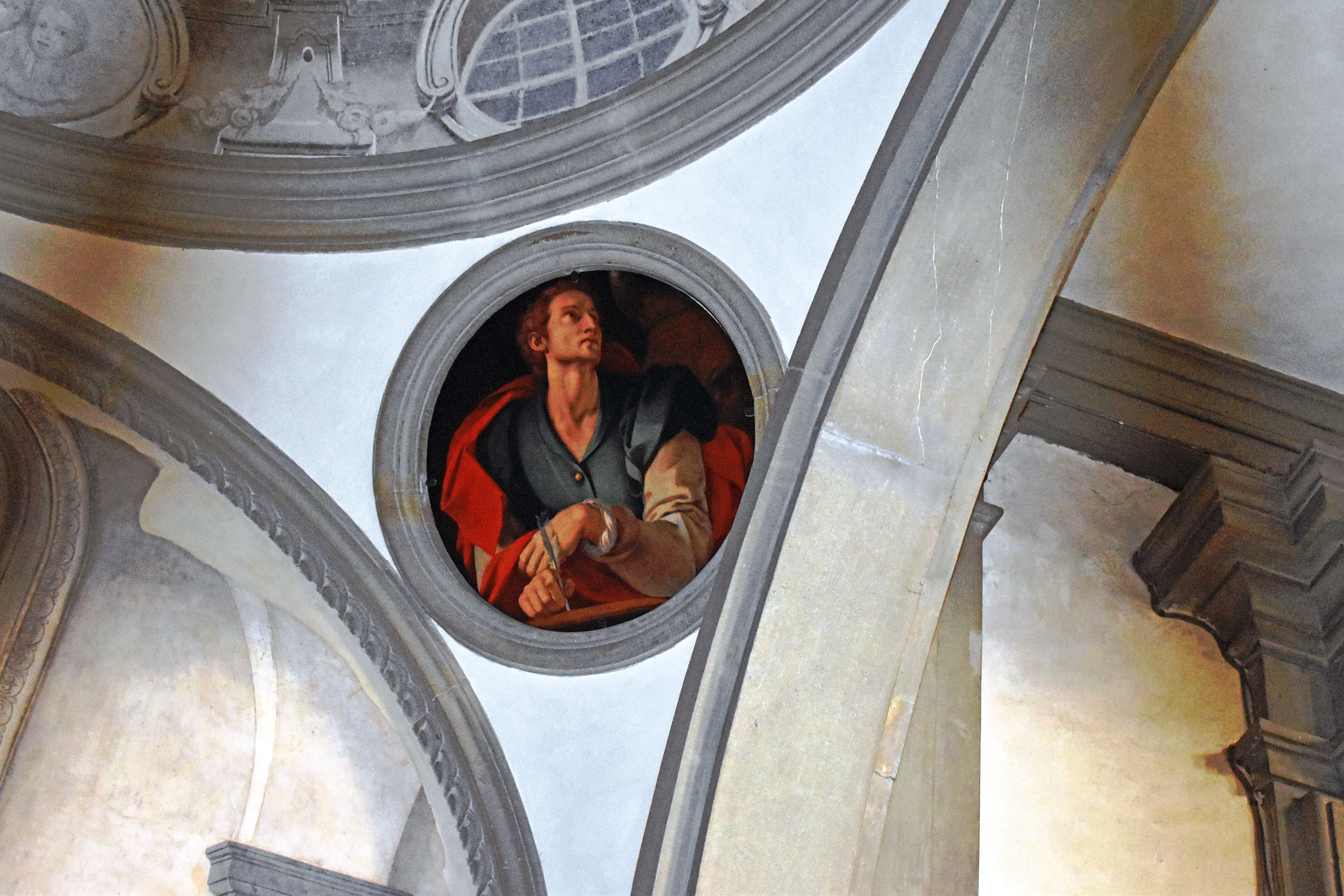 In alto quattro tondi affrescati, uno per ciascun pennacchio della cupola, i quattro evangelisti, due opera del Pontormo (San Luca e Giovanni) e due del Bronzino suo allievo (San Marco e San Matteo, altri studiosi gli attribuiscono solo San Marco)