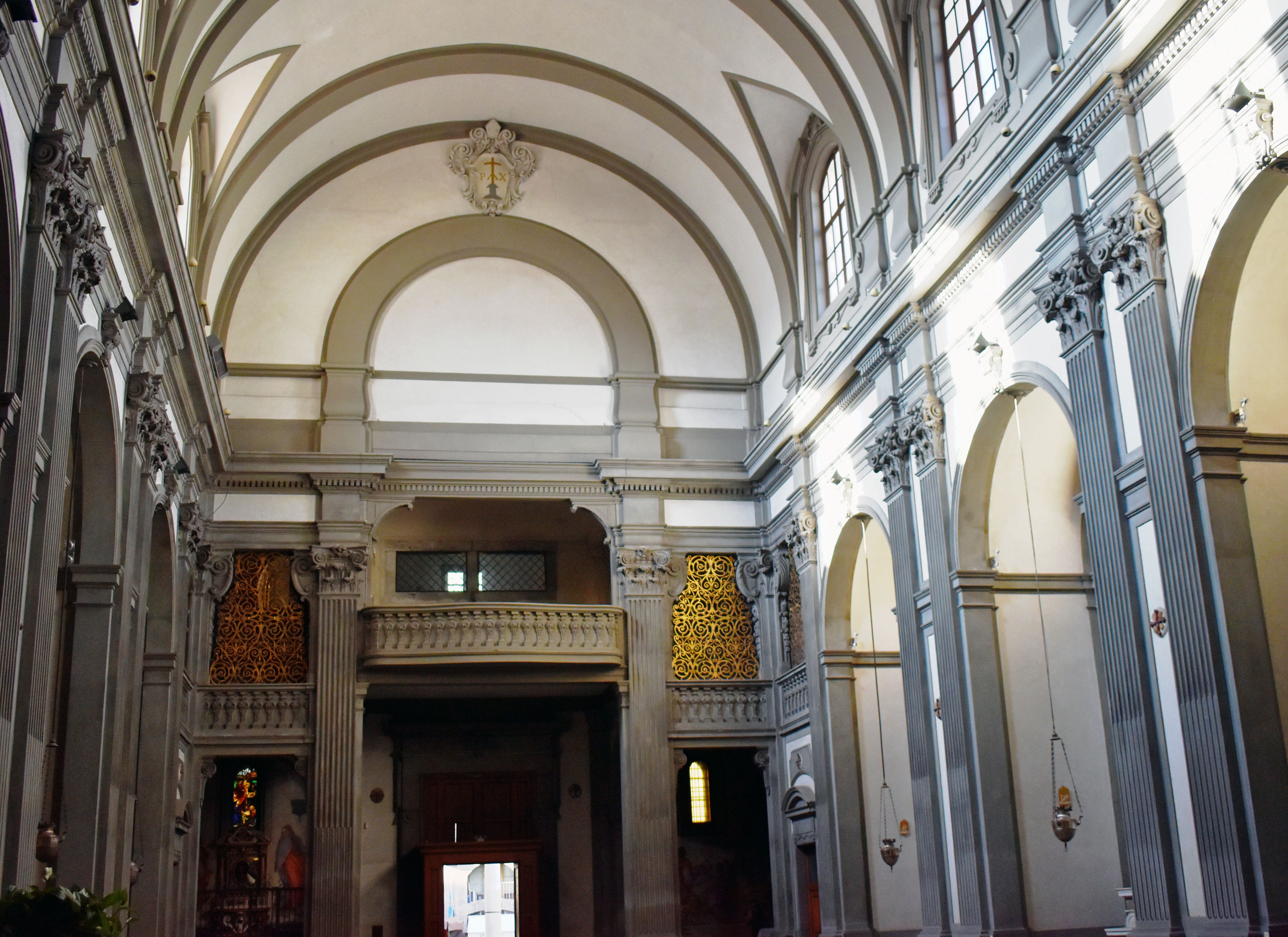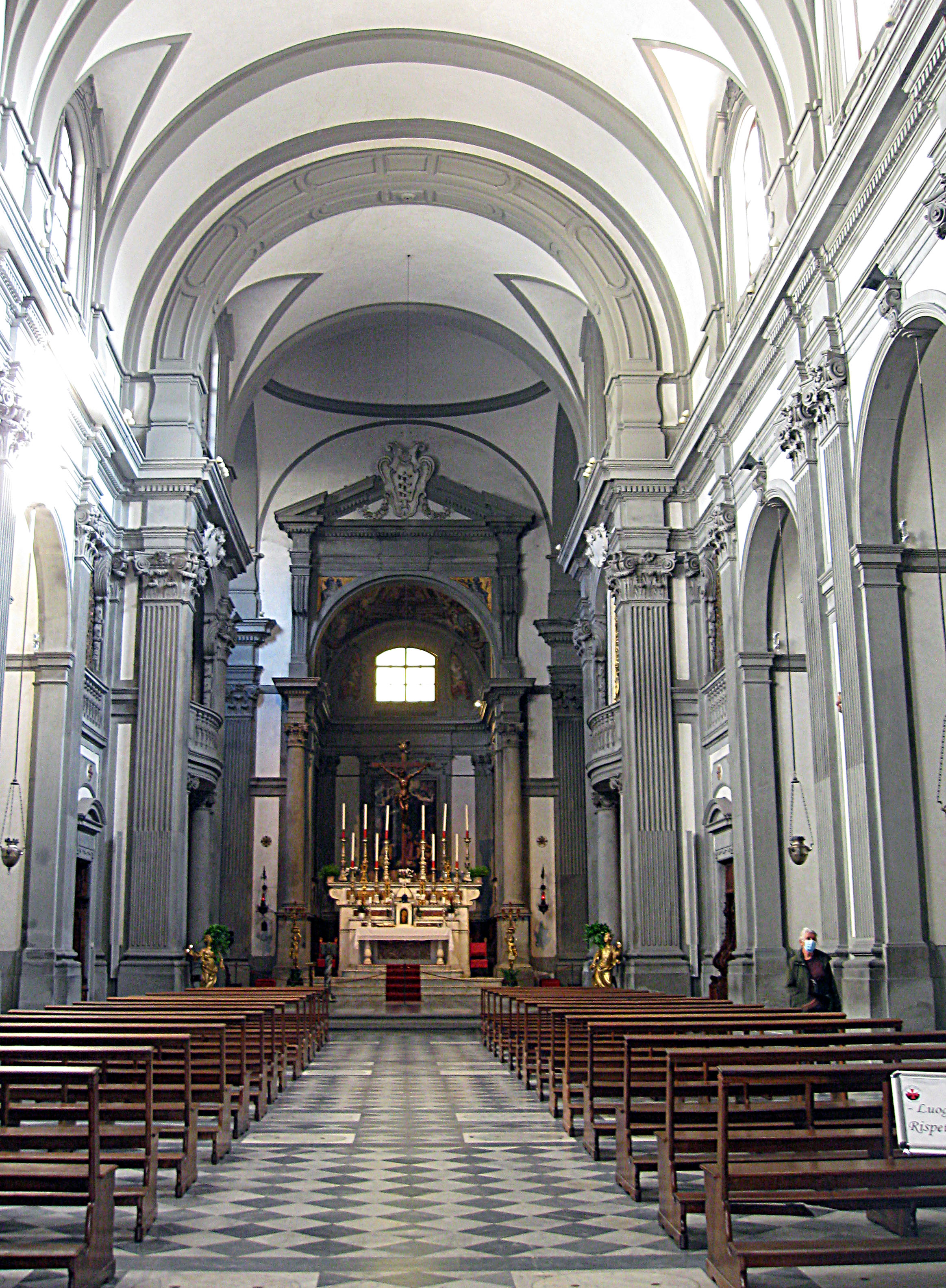 All’interno un’unica navata cui fanno ala alte e scanalate lesene tra le quali si aprono le cappelle. Una curiosità: percorrendo la navata centrale verso l’uscita, levando lo sguardo in alto vediamo una “finestra” che si apre dal Corridoio vasariano verso l’interno della chiesa da dove era possibile assistere alle funzioni da parte dei granduchi.