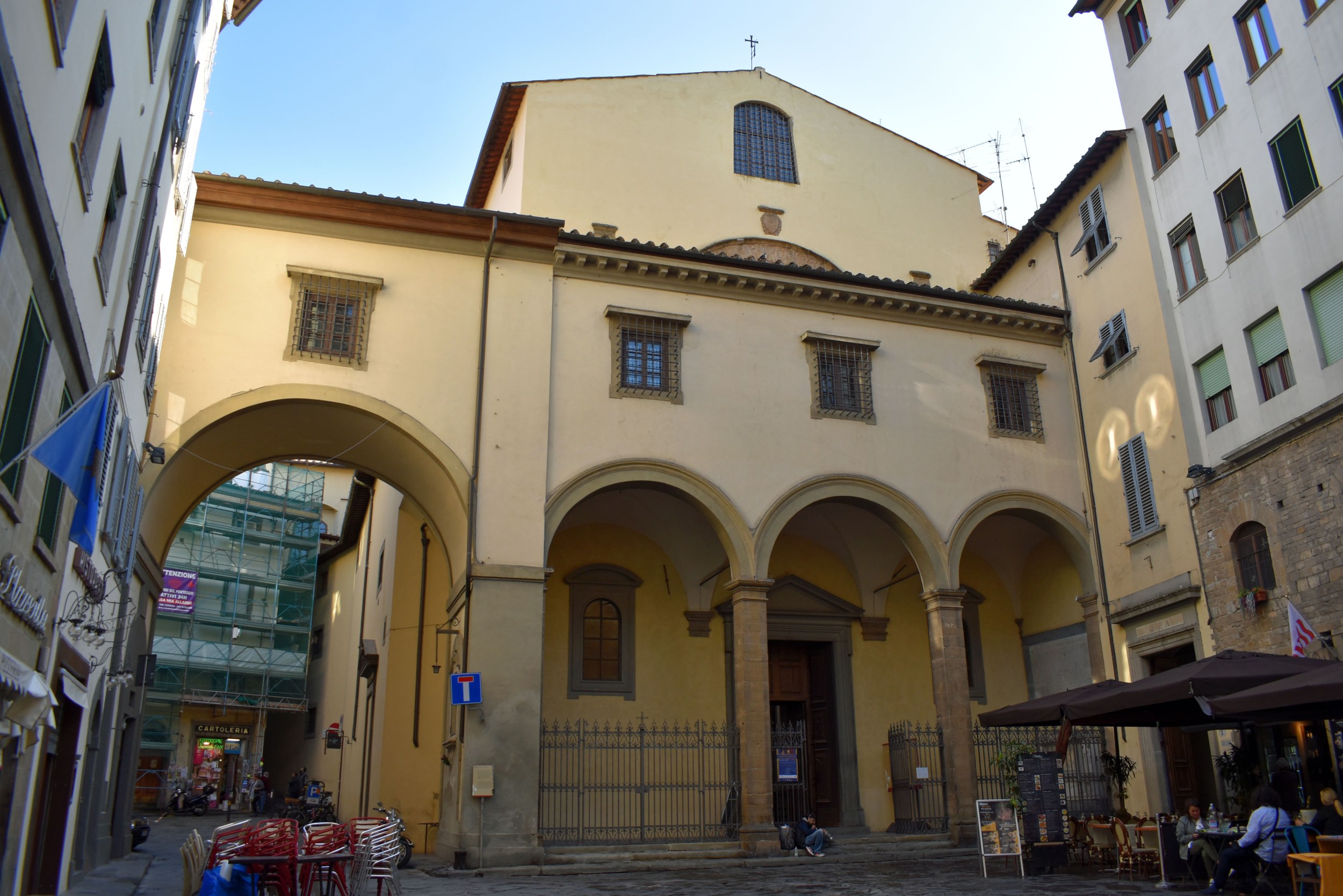 Siamo in via de’ Guicciardini una dirittura che porta a Ponte Vecchio da una parte e a Palazzo Pitti dall’altra. La piazzetta omonima che ospita la chiesa è sottolineata da una colonna di granito datata XIV secolo. Sullo sfondo della piazzetta la chiesa con il suo bel portico vasariano e, se si solleva il naso all’insù, con il più famoso Corridoio che lo sovrasta.