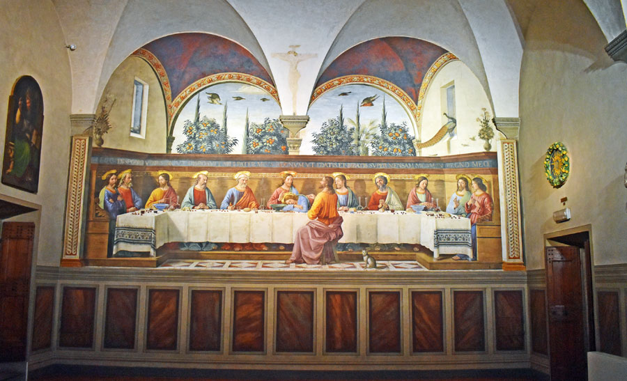 Nella stanza giganteggia la Piagnona, la campana che chiamava in San Marco i seguaci di Savonarola detti Piagnoni. Procediamo quindi verso il Refettorio piccolo, a sinistra prima delle scale, l’affresco del Ghirlandaio, 1480 circa, con L’ultima cena. La pittura, ricca di simbologie raffigura accanto a Giuda, il traditore, un gatto, considerato animale infido, quindi sulla tovaglia le ciliegie, simbolo del sangue versato dal Cristo, in alto il pavone e il fagiano simbolo della resurrezione, e le starne attaccate dai rapaci, simbolo del sacrificio del Cristo come le palme a significarne il martirio. Con ancora il fascino di tanta bellezza e grandiosità, continuiamo alla ricerca di quanto cerchiamo.
