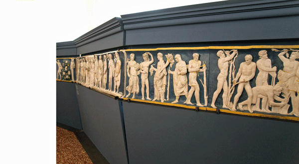 Sull’architrave della facciata si trova il fregio in terracotta, considerata uno degli esempi più alti di rappresentazione figurativa di epoca laurenziana databile intorno al 1490. Quella che si vede è intuibilmente una copia, magistralmente eseguita negli anni ’80 dalla manifattura Richard-Ginori affinché l’originaria, conservata in una sala al primo piano della villa, non rischiasse il deterioramento da agenti esterni.