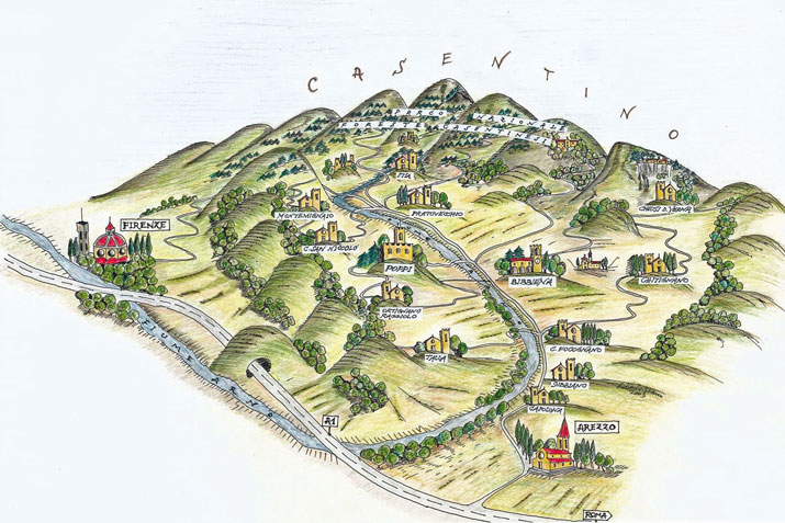 Vi sono in Casentino piccoli siti archeologici con materiali appartenenti alla civiltà etrusca e curiosamente il più antico di questi si trova a nord alle falde del Monte Falterona e non verso Arezzo. La civiltà “orientalizzante” penetrò per vie d’acqua nell’area di lingua etrusca. Le vie d’acqua interne consentivano di arrivare dal Mar Tirreno almeno fino a Cortona, Arezzo e Poppi dal Tevere, e a Firenze e Vicchio di Mugello dall’Arno e la Sieve. Lo sviluppo urbano di Perugia, Orvieto, Chiusi, Cortona e Arezzo avvenne in virtù delle vie d’acqua interne all’Etruria, come è ormai chiaro. Se ad Arezzo si fabbricavano le spade per l’esercito di Roma, come riporta Tito Livio, non era perché ad Arezzo vi fossero miniere di ferro, ma perché c’era l’acqua dei torrenti dell’Appennino che muoveva i magli e i mantici delle ferriere, come del resto è accaduto fino ad oggi. Mentre il minerale arrivava ad Arezzo da Populonia e dall’Elba per vie d’acqua. In epoca etrusca si svilupparono anche vie di fondovalle, ma solo dopo la bonifica di queste aree che fu conseguenza della navigabilità dei corsi d’acqua canalizzati per mezzo quelle opere idrauliche che resero famosi gli Etruschi (Gli Etruschi maestri di idraulica, AA. VV. Electa, 1991).