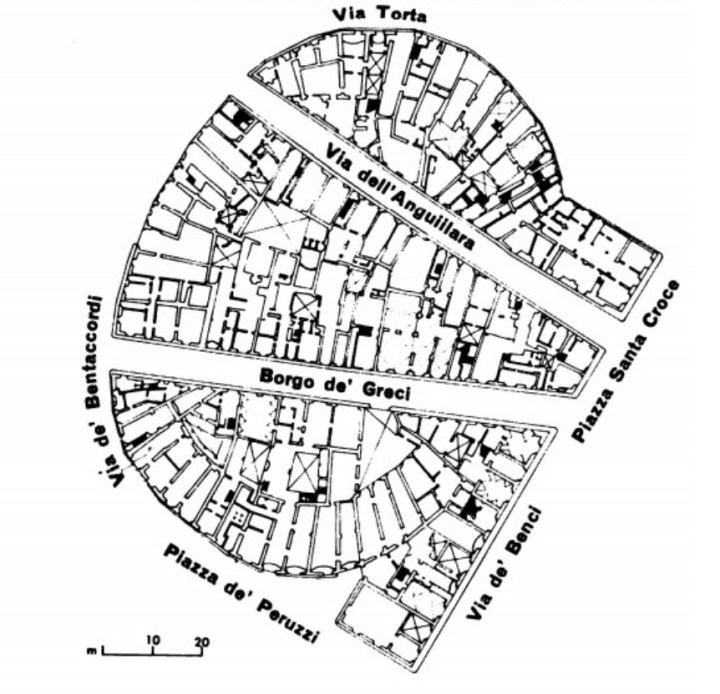 Posta in una situazione geografica assai favorevole al centro dei collegamenti nord sud ed est ovest Firenze divenne la principale città dell’Etruria settentrionale, nodo di strade consolari, municipali e importante centro commerciale; furono costruiti numerosi edifici pubblici e privati, compresi l’anfiteatro e il teatro, databile fra il 120 e il 130, che occupava l’area fra le attuali vie dei Benci, Torta e Bentaccordi, e la piazza Peruzzi. All’inizio del XIV secolo proprio i Peruzzi ricavarono le loro case nella parte sud della struttura.
