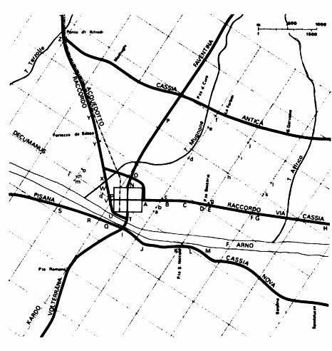 Nel territorio esterno all’urbs la centuriazione non seguiva lo stesso orientamento del cardo e del decumano presenti all’interno delle mura ma la divisione del terreno venne impostata sull’asse della via Cassia, la strada consolare proveniente da Arezzo che attraversava la città da est a ovest verso Lucca, assunta come decumano base. Tracce della centuriazione (maglia quadrata con lato di circa 710 metri) sono evidenti nella cartografia storica e ancora riconoscibili nell’assetto della pianura ad ovest di Firenze tra Castello e Prato come possiamo ancora riscontrare nella veduta dello Zocchi di Firenze dal colle di Montughi del 1744.