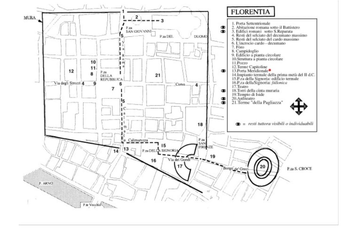 Posta in una situazione geografica assai favorevole al centro dei collegamenti nord sud ed est ovest Firenze divenne la principale città dell’Etruria settentrionale, nodo di strade consolari, municipali e importante centro commerciale; furono costruiti numerosi edifici pubblici e privati, compresi l’anfiteatro e il teatro, databile fra il 120 e il 130, che occupava l’area fra le attuali vie dei Benci, Torta e Bentaccordi, e la piazza Peruzzi. All’inizio del XIV secolo proprio i Peruzzi ricavarono le loro case nella parte sud della struttura.