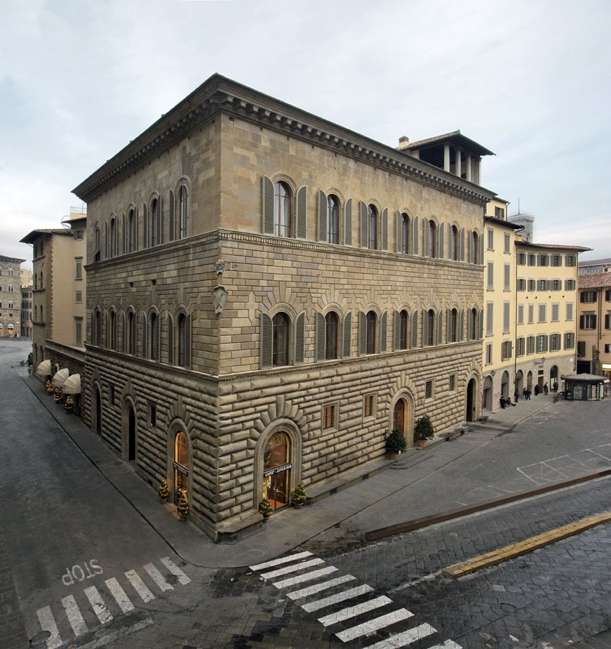 “La via che dal lato di tramontana fiancheggia Palazzo Vecchio si diceva in antico Via delle Prestanze dal nome di un pubblico ufficio che vi ebbe la sua sede : si chiamò , dipoi dei Gondi quando Giuliano di Lionardo Gondi acquistò tutto un gruppo di antiche case per edificarvi sopra lo stupendo palagio disegnato da Giuliano da S. Gallo. Il palazzo de’ Gondi non fu poi finito che in parte e la facciata principale corrispondente sulla Piazza di S. Firenze, già di S. Appollinare, si arrestava accanto ad una massiccia fabbrica di pietra di carattere del XVI secolo che sporgeva irregolarmente, tanto verso la Chiesa di S. Firenze, quanto verso Palazzo Vecchio. La necessità di render più facile il passaggio in quel punto centrale e frequentatissimo della città, portò alla distruzione di quella vecchia casa ed all’allargamento della strada fino a Piazza della Signoria. E così la nobile famiglia Gondi colse l’occasione per completare il progetto del Sangallo voltando il palazzo sulla via nuovamente allargata e ripetendo sulla nuova facciata il disegno di quella vecchia. Il lavoro grandioso, alla spesa del quale contribuì anche il Comune, fu eseguito sotto la direzione dell’illustre architetto Giuseppe Poggi e riuscì a meraviglia, tantoché si può oggi ammirare in tutta l’elegante e severa bellezza delle sue forme la stupenda opera ideata e condotta solo a metà da Giuliano da Sangallo. La costruzione di quel palazzo era stata iniziata sul finir del xv secolo da Giuliano di Lionardo Gondi il quale aveva in più volte comprato varie case dalle famiglie Asini e Sacchetti, dall’Arte de’ Mercatanti e dal Comune. Per l’allargamento della strada si dovette diminuire la facciata dell’interessante palazzo che fa angolo in Piazza della Signoria e che servì un giorno di residenza al Tribunale di Mercanzia. Difatti sulla facciata, che nonostante le vicende subite serba in gran parte il carattere suo primitivo, è un bel fregio di pietra nel quale sono scolpiti gli stemmi delle 7 arti maggiori e delle 14 minori.