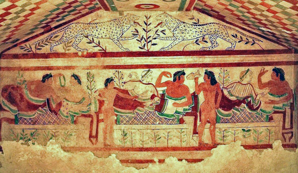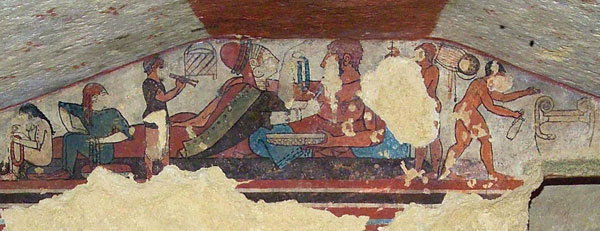 In Etruria intorno ai primi del VI secolo a. C. cominciano ad apparire frequenti rappresentazioni del banchetto nell’ambito quotidiano (ad es. sulle lastre di terracotta decorate a rilievo provenienti dal Palazzo di Murlo, nei pressi di Siena,del VI secolo a.C.) ed in quello funerario (ad es. nelle pitture tarquiniesi della Tomba della Caccia e della Pesca della fine del VI secolo a.C. e della Tomba del Frontoncino della metà del VI secolo a.C.) i cui partecipanti non sono più rappresentati seduti, ma distesi, da soli, in coppia od anche in più persone, su letti triclinari.