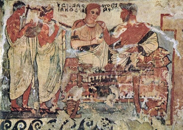 Gli autori antichi (Diodoro Siculo, Aristotele, Posidonio di Apamea, Teopompo, etc.) fanno riferimento al banchetto etrusco.