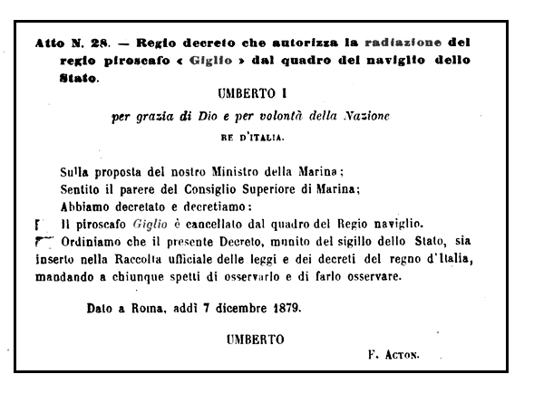 Quando nel 1861 il Giglio entrò a far parte della Regia Marina italiana aveva ormai una quindicina d’anni passati quasi continuamente in mare: col il suo scafo in legno e la propulsione a ruote ci si poteva aspettare che come tante altre navi di tipo sorpassato o logore entrate a far parte della flotta sarebbe stato presto radiato.