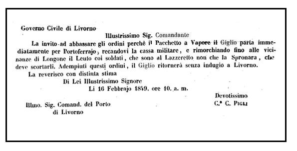 Poco più tardi ritroviamo il Petracchi a guidare una ricognizione lungo la via litoranea verso la Versilia alla ricerca di un forte nucleo di truppe rimaste fedeli al Granduca e, bloccato dalle interruzioni stradali, il 22 febbraio 1849 scrisse al Governatore di Livorno Pigli: …sono a Viareggio: mandate qua subito il Giglio. Laugier ha rotto i ponti. Mandatemelo subito se no non posso passare…A seguito di questa richiesta il piroscafo riprese quindi il mare ed era in programma anche lo sbarco a Viareggio del distaccamento di soldati che aveva imbarcato che tuttavia non avvenne perché l’avversario aveva posizionato sulla spiaggia alcune batterie con le quali la nave non era in grado di impegnarsi a causa del suo armamento limitato.