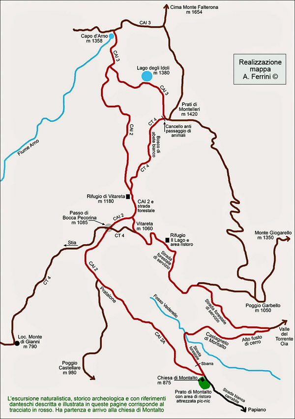 E’ palese che il lago fosse frequentato anche da soldati che vi si recavano per guarire le loro ferite, ma l’ipotesi che dalla cima del Falterona transitasse una strada importante che metteva in comunicazione il Casentino con la pianura Padana non è sostenibile, è semplicemente assurdo. Vi transitava, come oggi, il sentiero del Passo delle Crocicchie ma il lago fu in epoca etrusca un luogo di pellegrinaggio per il significato che all’epoca poteva avere sia per il fatto che si trovava a pochi metri dalle sorgenti del bacino Arno-Tevere: i due fiumi e la montagna dalla quale scaturivano rivestivano un significato importante per la popolazione pastorale della regione che aveva la residenza estiva sull’Appennino e quella invernale sulla costa tirrenica dove i due fiumi riversano le acque della montagna nel mare. Esattamente come accade nelle regioni dei pastori Valacchi del Pindo. J. R. McNeill The mountains of the mediterranean world, Cambridge University Press, 1992 .