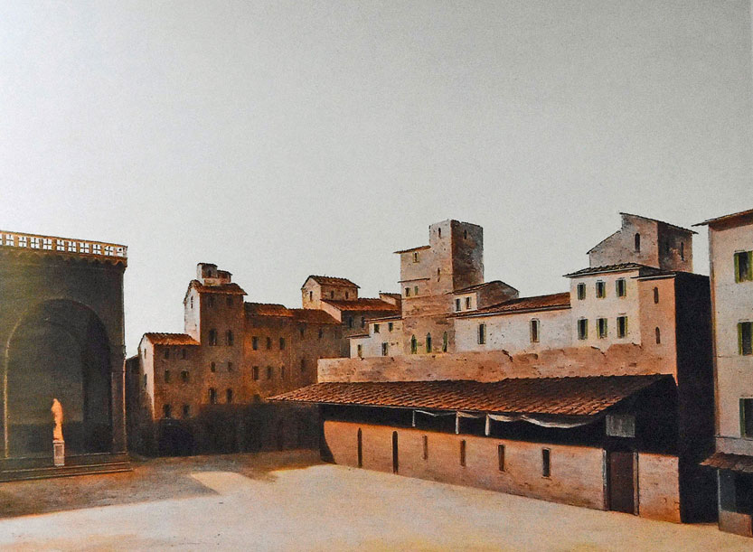 “Rammentava un triste periodo ed un tristissimo episodio della storia toscana, quell’ampia e massiccia tettoia che sorretta da grandi mensoloni di legno sui quali poggiavano travi e travicelli, sporgeva da una vecchia ed informe fabbrica situata proprio di prospetto a Palazzo Vecchio. La tettoia sovrastava, difendendole dal sole e dalla pioggia, una serie di finestre che aprivansi nel vano murato di vecchie arcate a cunei di pietra e quelle finestre illuminavano gli uffici della posta delle lettere1. La posta di Firenze, senz’ essere né elegante, né comoda, aveva così un aspetto singolare, unico nel suo genere e che stava, si può dire in armonia col tipo originalissimo della vecchia città. Sull’angolo verso Calimaruzza un ampio portone dava accesso ad un atrio che serviva di ricetto ai carrozzoni delle vecchie corriere postali e dall’opposto lato, verso Vacchereccia sorgeva una massiccia e bruna torre di considerevole altezza, per quanto alla pari di tutte le altre della città fosse stata scapezzata quando il governo popolare volle fiaccare l’alterigia e la prepotenza dei grandi.