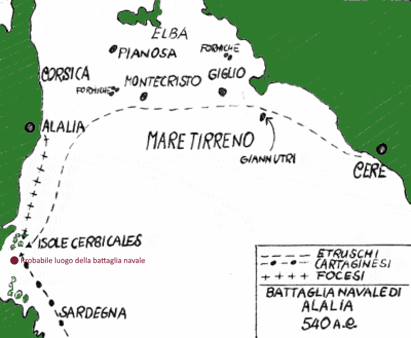 Le due potenze spinte dalla nuova minaccia si unirono dando luogo all’epico scontro navale (540 a.C. circa) nelle acque antistanti le coste della Corsica settentrionale e della Sardegna meridionale.