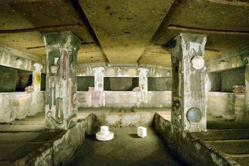 Fra le numerosissime tombe di ogni epoca e tipo, famosa è la Tomba dei Rilievi, un ipogeo che replica la pianta e l’aspetto di una casa etrusca, con stucchi colorati realistici raffiguranti oggetti e suppellettili appesi o accostati alle pareti e alle colonne.