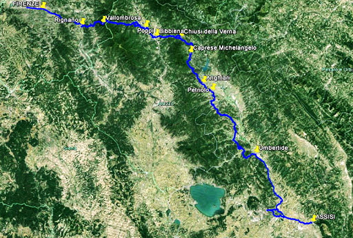 Arrivata a Poppi questa via pare traversasse l’Arno di fronte all’estuario del torrente Sova e oltre l’Arno voltava a destra e arrivava al torrente Rignano dove ancora esiste un ponte dietro il cementificio Baracchi, da lì traversata la SS 71 passava per Camprena, traversava l’Archiamo e raggiungeva, non conosciamo ancora l’itinerario preciso, da Catarsena, il Bivio di Banzena, scendeva sul Torrente Corsalone a Casa Fiume, risaliva a Montesecco, Formicola, Tramoggiano seguiva il Fosso Orcine per Il Casone, e La Beccia a la Verna, da dove prendendo la via di Compito e Pieve S. Stefano raggiungeva Borgo San Sepolcro. Oggi questo itinerario, con il nome di Via Ghibellina serve per il pellegrinaggio da Firenze and Assisi.