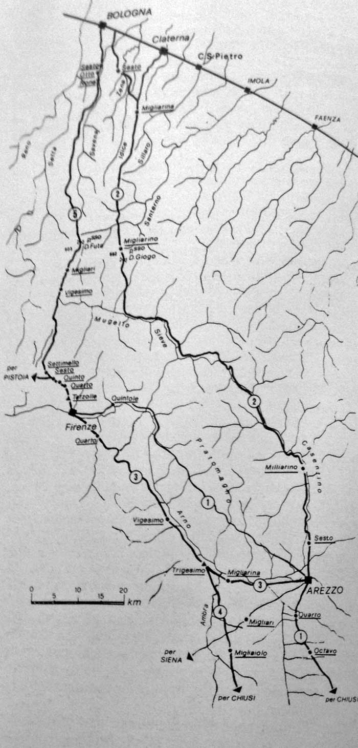 La prima seguiva grossomodo l’odierna Porrettana che da Bologna per Casalecchio, Sasso Marconi, Brasimone, Porretta scende verso Pistoria Prato, Sesto Fiorentino per poi proseguire verso Incisa e Arezzo. a est e verso Luni e Lucca a ovest.