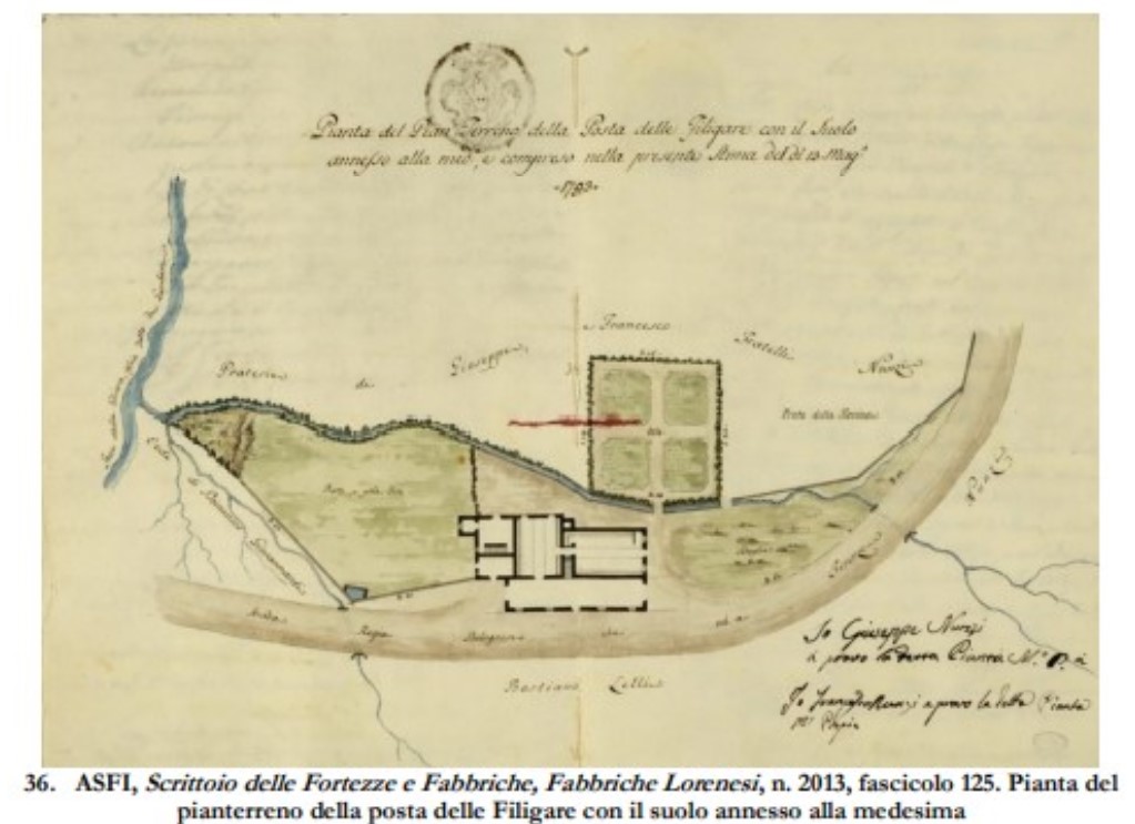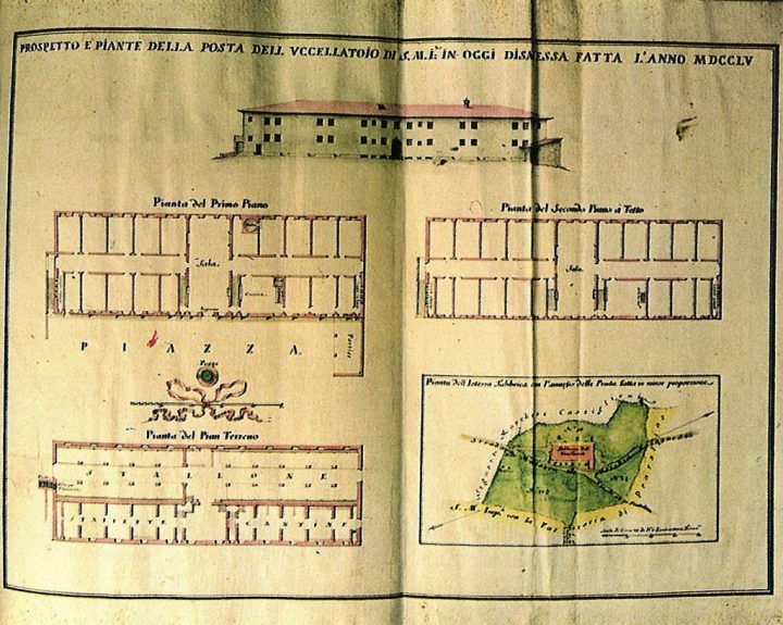 Partendo da Porta San Gallo, a Firenze, verso Bologna, la prima posta era all’Uccellatoio, situata nei pressi della villa di Pratolino2; era costituita da un edificio molto grande e sviluppato su tre piani, come evidenzia la planimetria, un piazzale antistante a un loggiato la separava dalla strada maestra e sul lato a est un grande portone introduceva all’edificio perpendicolare rispetto al fabbricato, destinato alle stalle, una pubblica molto ampia e altre più piccole ad uso privato. Nel 1755, pochi anni dopo l’apertura del nuovo tracciato della strada, la stazione fu chiusa e spostata in una nuova struttura a Fontebuona distante circa un’ora e mezzo da Firenze e dove fin da tempi antichi si celebrava la bontà dell’acqua di una fonte spontanea.