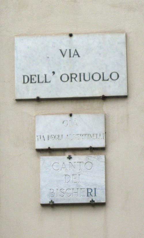 Il nome glielo avevano dato volgarmente e tutti la conoscevano per Via Buja; ma in antico aveva anche altri nomi: ma più particolarmente ebbe per un lungo periodo di tempo quello di Via Bertinella o Albertinella dal nome della famiglia Albertinelli o Bertinelli che in epoca remota vi aveva le case (Le case degli Albertinelli o Bertinelli erano per la maggior parte nel luogo occupato dal primitivo Spedale fondato da Folco Portinari, fra Piazza di S. Maria Nuova e la Via dell’Oriuolo, nel luogo oggi occupato dalla fabbrica dell’ Archivio Notarile). Oggi è un tratto della Via dell’Oriuolo, che il cartello municipale chiama…. ingenuamente, dell’Orivolo, strada, che come ognun sa, ebbe questo nome perché in una casa che vi corrisponde fu costruito il primo orologio per la torre di Palazzo Vecchio.