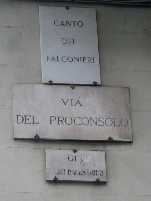 Dal lato opposto, sul canto della Via già de’ Balestrieri, oggi del Proconsolo, erano delle case della famiglia Bischeri tanto che la località era detta il Canto de’ Bischeri ed altre fabbriche appartenute un giorno ai Cennamelli, ai Buonafedi, ai Falconieri, ai Pazzi.