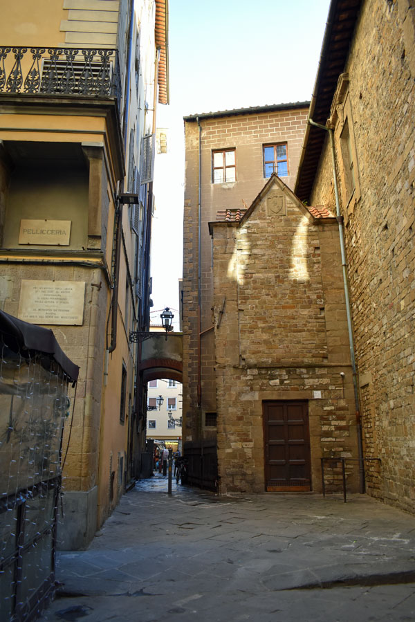 Fra Pellicceria e Calimala era un gruppo di fabbriche di solidissima costruzione e di un tipo congenere, mantenuto in parte fino agli ultimi anni ed in parte guasto ed alterato da moderne superfetazioni e riduzioni. V’erano palazzi e case ed in uno spazio relativamente angusto sorgevano nientemeno che sei torri: palazzi e torri appartennero ai Cavalcanti, ai Siminetti, ai Bostichi, ai Benzi, ai Della Sannella, ai Nobili e fra le torri una ne sussisteva di faccia alla loggia di Mercato Nuovo, quella de’ Siminetti, mentre altre, tra le quali una chiamata la torre piena, s’innalzavano tra le casupole di quell’andirivieni di oscuri vicoletti che attraversavano quest’isola di fabbricato. Ora di tutte queste fabbriche contro la maschia solidità delle quali hanno picchiato per mesi ed anni i martelli demolitori, non restano che il ricordo. È una debole speranza quelle di conservare almeno un solo esempio di questo tipo architettonico, perché fra i progetti in corso di studio per il nuovo edificio della Biblioteca Nazionale* che si spera di erigere in questa località, c’è anche quello d’incorporare tutte la fabbriche fino a Via Monalda) pochi rilievi e studi fatti fare dalla commissione storica artistica comunale.”
