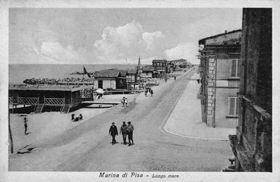 Dalla sinistra sponda dell’Arno che calmo e pianeggiante si allarga per deporre in seno al Tirreno il tributo delle sue acque, muove lunga e dritta fronteggiando il mare che trasporta e depone sulla riva dei monti di finissima arena, un’ ampia e bella via, una specie di viale che ha uno dei suoi lati fiancheggiati da belle fabbriche, da graziose palazzette, da eleganti villini. E la via sempre popolata di nuove costruzioni che annualmente si moltiplicano, prosegue per la lunghezza di quasi due chilometri e continua il suo cammino indirizzandosi verso Livorno che si scorge da lungi sporgente dinanzi al bruno colle di Montenero. Questo lungo e ridentissimo viale, delle strade traverse appena iniziate, un piazzale rotondo, dei villini verso la pineta o in mezzo ai campi ubertosi e fiorenti, dei piccoli, ma graziosi stabilimenti balneari, delle capanne circolari piantate sulla sabbia, costituiscono l’attuale paese di Marina di Pisa, una Stazione balnearia che nata da poco ha prosperato con rapidità meravigliosa e che promette di essere fra breve in grado di far concorrenza a qualche altro luogo di bagni più vecchio e più celebrato.