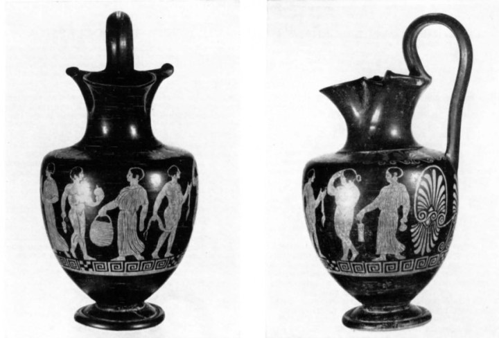 Il popolo etrusco fu definito da Tito Livio “il popolo più di ogni altro dedito alle pratiche religiose” (Ab Urbe condita, V, 1,6). Alla luce di questi studi, Simona Rafanelli ha proposto l’esame di tre documenti fra i meno noti e indagati. L’autrice propone l’esame di una piccola oinochoe (brocchetta da vino) a figure rosse proveniente dalla necropoli dell’Osteria di Vulci, conservata nel Museo di Villa Giulia a Roma, che raffigura una scena sacrificale dove si osservano le operazioni che precedono l’immolazione della vittima, seguita dalla libagione e dalle offerte incruente. L’altare, dalla ricca modanatura, è posto al centro della scena dividendola in due. Da un lato l’offerta sacrificale cruenta, dall’altro quella incruenta. Nella parte destra si vedono delle offerte solide posate su un tavolo accanto un giovane nudo, guarda l’altare mentre porge una patera con la mano destra al di sopra del tavolino, mentre nella mano sinistra, abbassata, tiene una benda di stoffa. Sulla sinistra dell’altare c’è una cerbiatta tenuta per una corda da un secondo giovane nudo, coronato con tenia e indossante una grande armilla con bullae al braccio. Nella destra impugna un grande coltello sacrificale con lama triangolare (secespita). Sull’altare ornato con corona di alloro, arde un fuoco. Su di un lato poggia un incensiere. La scena “fotografa” l’attimo che precede il sacrificio della vittima e la libagione delle offerte incruente prima e dopo il versamento del sangue e la cottura delle carni della vittima. La benda (tenia) che cinge la testa dei giovani e la corona di alloro che adorna l’altare suggeriscono preliminari riti di purificazione che riguardano la vittima, i partecipanti al rito e lo stesso altare. L’immagine risale all’epoca tardo classica e testimonia una continuità con le rappresentazioni precedenti, arcaiche e classiche.