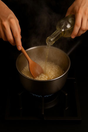 Subito dopo, aggiungi il riso e tostalo a secco, finché diventa lucido.