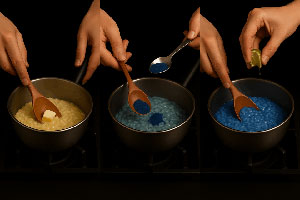 Quando il riso è pronto, spegni il fuoco e manteca con burro freddo, spirulina blu e un filo di succo di lime.