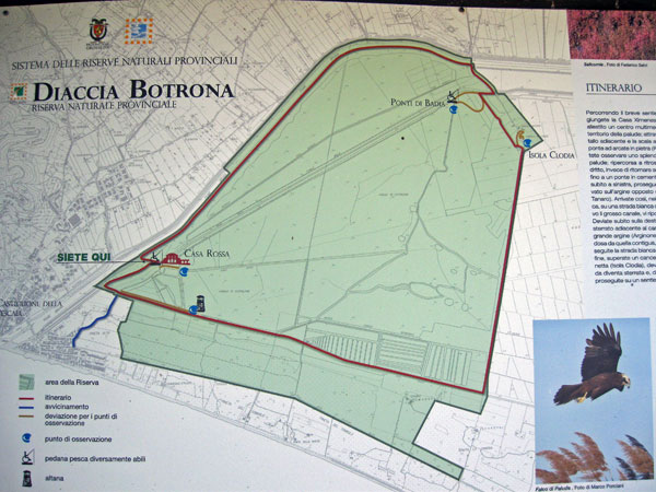 È un’ampia distesa umida, si estende su oltre mille ettari ed è tra le più la più significative aree umide italiane di importanza internazionale secondo la Convenzione di Ramsar del 1971. La Casa Rossa fa da centro di partenza per le visite da effettuare, volendo, su un battello per poter ammirare la flora e la fauna della palude che ovviamente offre uno spettacolo diverso a seconda delle stagioni. Da non perdere alla Casa Rossa l’interessante video che ripercorre ricostruendolo e illustrandolo graficamente in modo accattivante e pregevole dal punto di vista sia storico che grafico, il cambiamento dall’antico lago ai giorni nostri.