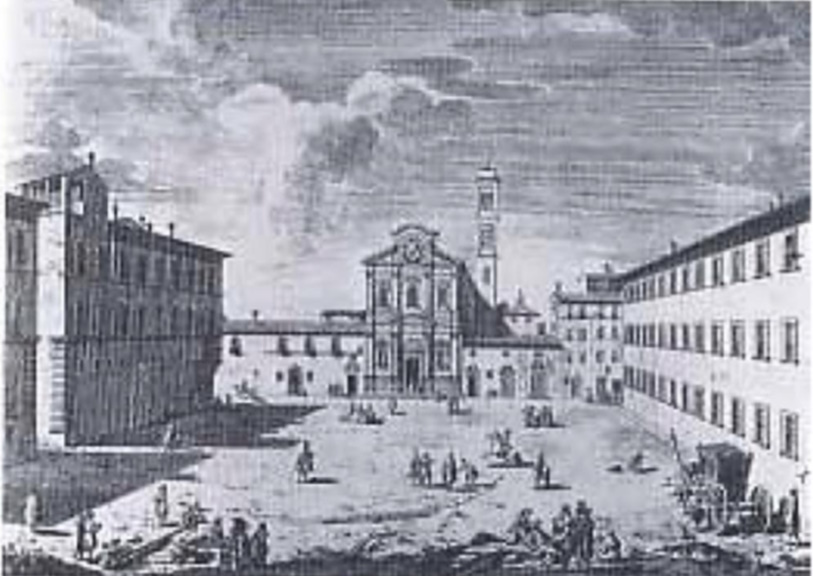 Il convento di Ognissanti fu fondato dai frati dell’ordine degli Umiliati venuti a Firenze dal Piemonte nel 1239. Un aspetto peculiare dell’ordine era legato al proposito di vivere del frutto del proprio lavoro: erano soprattutto operai tessitori e follatori di lana o operai addetti a industrie affini a quest’arte di cui favorirono e allargarono lo sviluppo, soprattutto nell’Italia settentrionale dove il movimento aveva il suo centro. Poco dopo il loro arrivo a Firenze, acquistarono un terreno prospiciente le rive del fiume Arno che allora si apriva in un’ansa, conformazione favorevole a quella manifattura e, per ricavare l’energia idraulica per il funzionamento dei mulini e delle gualchiere, costruirono la pescaia di Santa Rosa insieme ad un sistema di canali . Tutta la zona limitrofa era stata improntata alla nuova attività tanto che la piazza era completamente occupata dai lavatoi per la lavotazione della lana di cui gli Umiliati seguivano tutto lo svolgimento: dalla scelta della materia prima fino alla tessitura, compresa poi la commercializzazione dei manufatti detti “panni umiliati”.