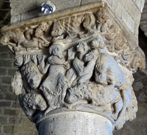 Il bel capitello, che sulla seconda colonna a destra con le spalle all’ingresso principale, non può non catturarci con i suoi segni e disegni. Racconta incisivamente la storia di Daniele nella fossa dei leoni. Una storia che conosce bene chi ha letto e riletto le pagine della Bibbia. Su due delle facce del capitello le sculture raffigurano il profeta Daniele con le braccia aperte e le mani alzate in mezzo ai leoni di cui alcuni gli leccano i piedi e nelle altre i leoni che sbranano i suoi delatori. In alto le due scene sono incorniciate da figure zoomorfe che si mordono e sbranano a vicenda e da fiori e frutti su cui strisciano serpenti. Come interpretare il racconto nel racconto di pietra che le raffigurazioni sui capitelli rappresentano?