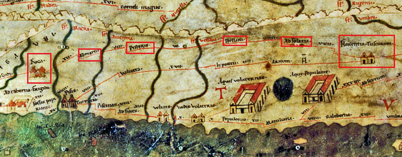 Nella piana lucchese, inoltre, sono presenti toponimi miliari come Quarto (presso Capannori), Quinto (tra Capannori e Porcari) e Settimo (tra Porcari e Turchetto) che testimoniano la sicura presenza di una strada romana il cui tracciato non è rintracciabile.