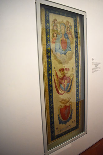 Sempre lungo il corridoio un palio di seta datato 1833. Anche a Grosseto nell’Ottocento si svolgeva il palio come quello più conosciuto e ancora in auge che si svolge a Siena. Del palio grossetano resta questa testimonianza: in alto riproduce la Madonna delle Grazie di Matteo di Giovanni conservata in Duomo, quindi lo stemma dei Lorena e lo stemma della città.