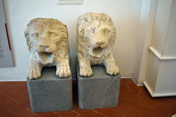 In fondo al corridoio da percorrere, quasi a guardia delle teche, due leoni di pietra con le bocche aperte: furono ritrovati nel 1822 in occasione dei lavori, con il contributo granducale, per la costruzione delle Terme un edificio neoclassico con una grande piscina circolare. Le acque termali di Roselle di Poggio Moscona erano già conosciute e utilizzate nell’antichità, abbandonate e poi ristrutturate e gestite nel tempo fino alla nuova inaugurazione sotto il granduca Ferdinando III. L’edifico ancora oggi visibile accoglieva cinque leoni, due presenti al Museo, dalle cui bocche fuoriusciva l’acqua termale nella piscina. Oggi non sono più funzionanti.