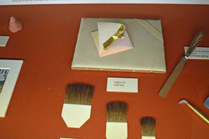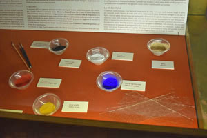 Nelle teche sono raccolti materiali e strumenti utilizzati per la realizzazione dei codici, si possono notare i vasetti con polvere di lapislazuli o di quarzo e una sottile lamina d’oro.